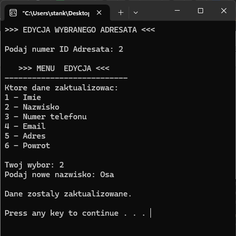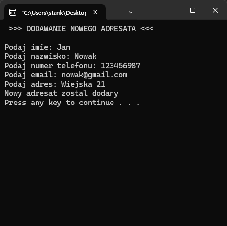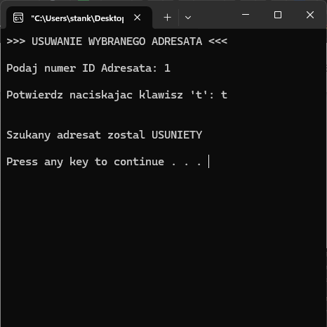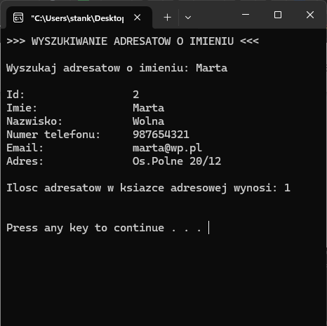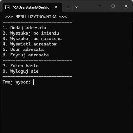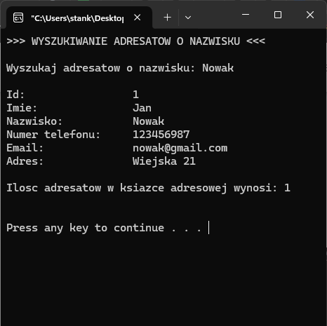 Książka adresowa to aplikacja konsolowa do zarządzania danymi adresatów oraz ich wyszukiwania. Posiada panel rejestracji i logowania. Po zalogowaniu możemy dodać adresata, edytować jego dane oraz usunąć go. Aplikacja posiada również możliwość wyszukiwania adresatów po imieniu lub nazwisku.